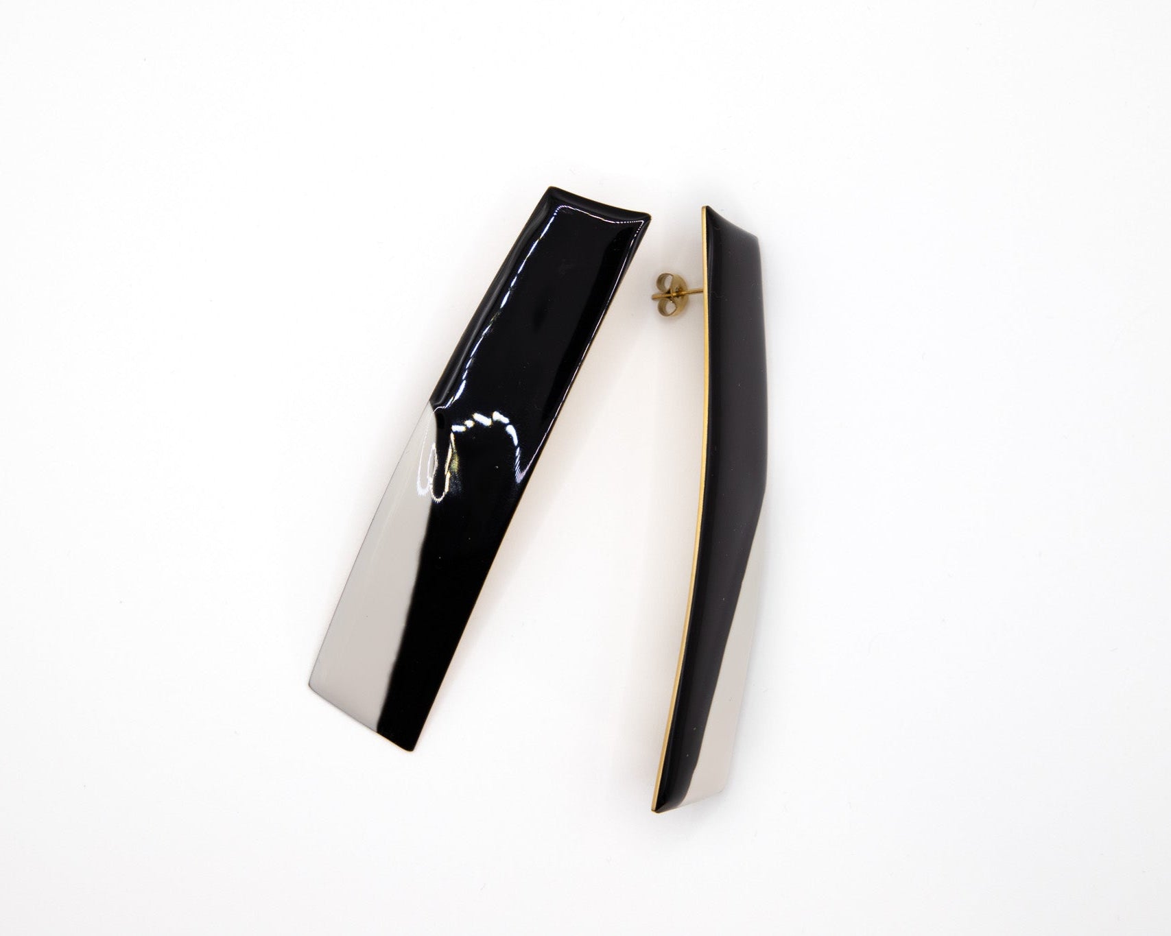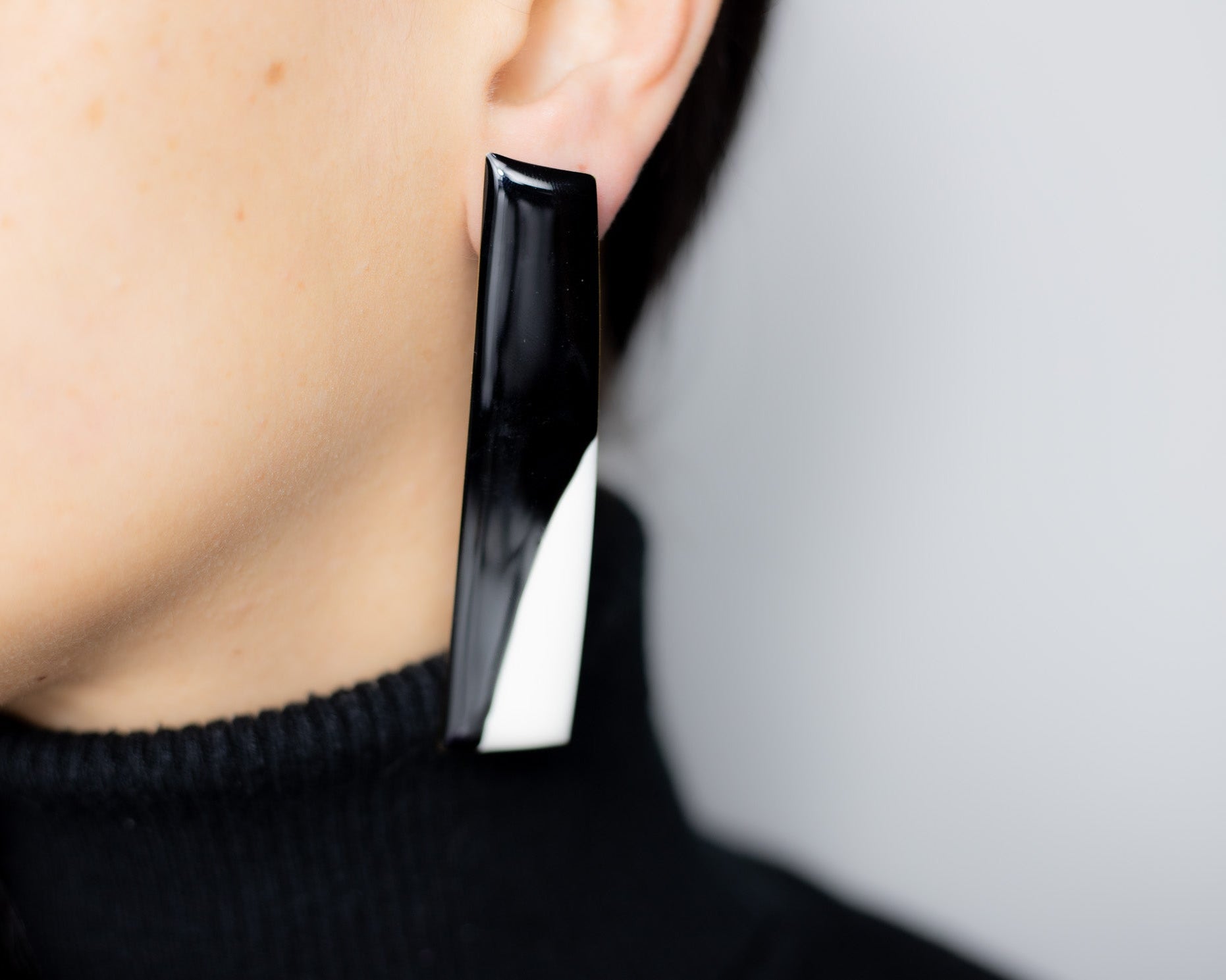 Dissonanza. Non sempre l’armonia nasce dalla somiglianza. A volte è lo scontro – il bianco contro il nero, il pieno contro il vuoto – a creare bellezza. Dissonanza è l’orecchino dalle linee decise, design architettonico, carattere che taglia come una lama. È un contrasto che non divide, ma definisce. Acciaio e smalto. Peso: 100 g Dimensioni: 7,8 cm