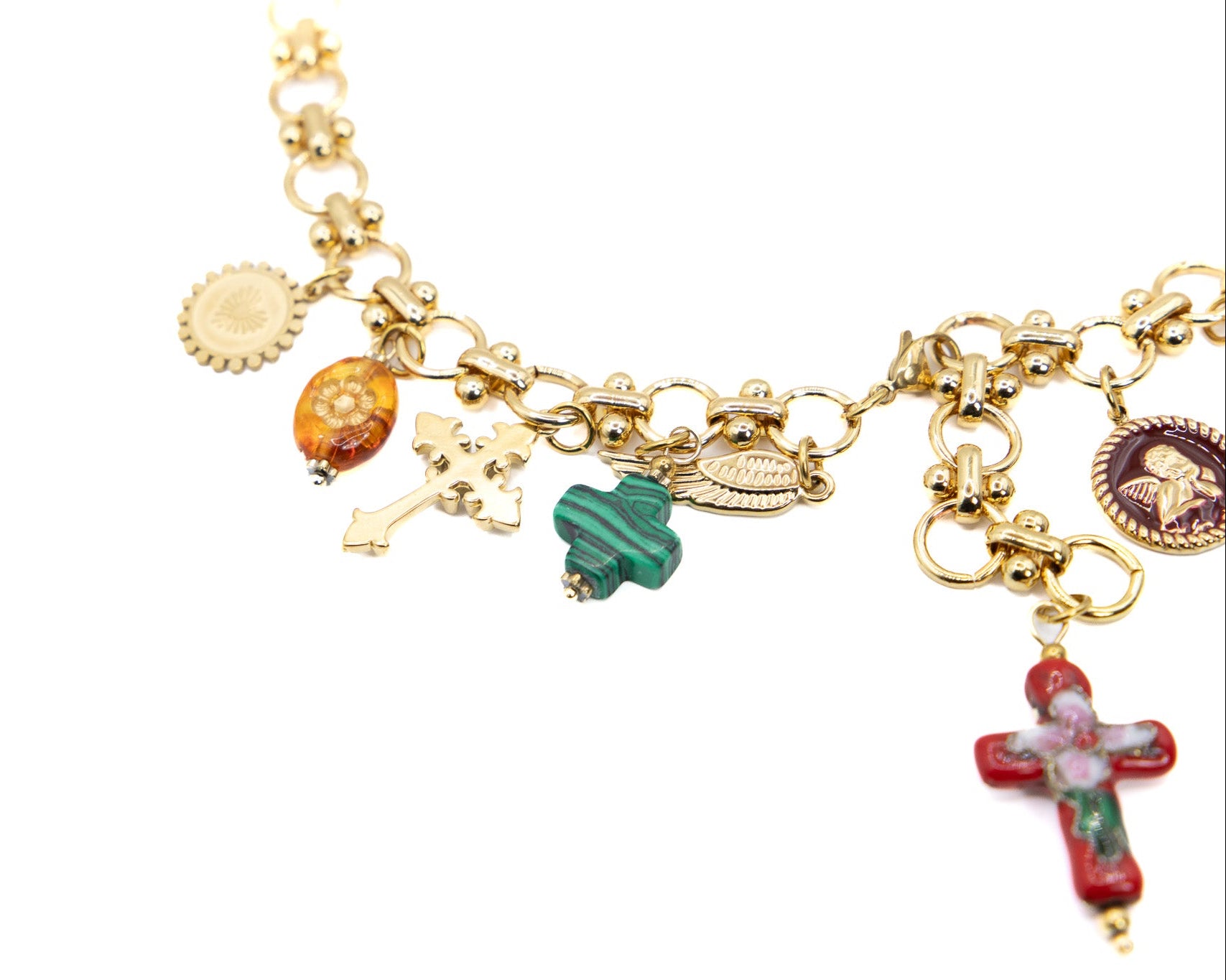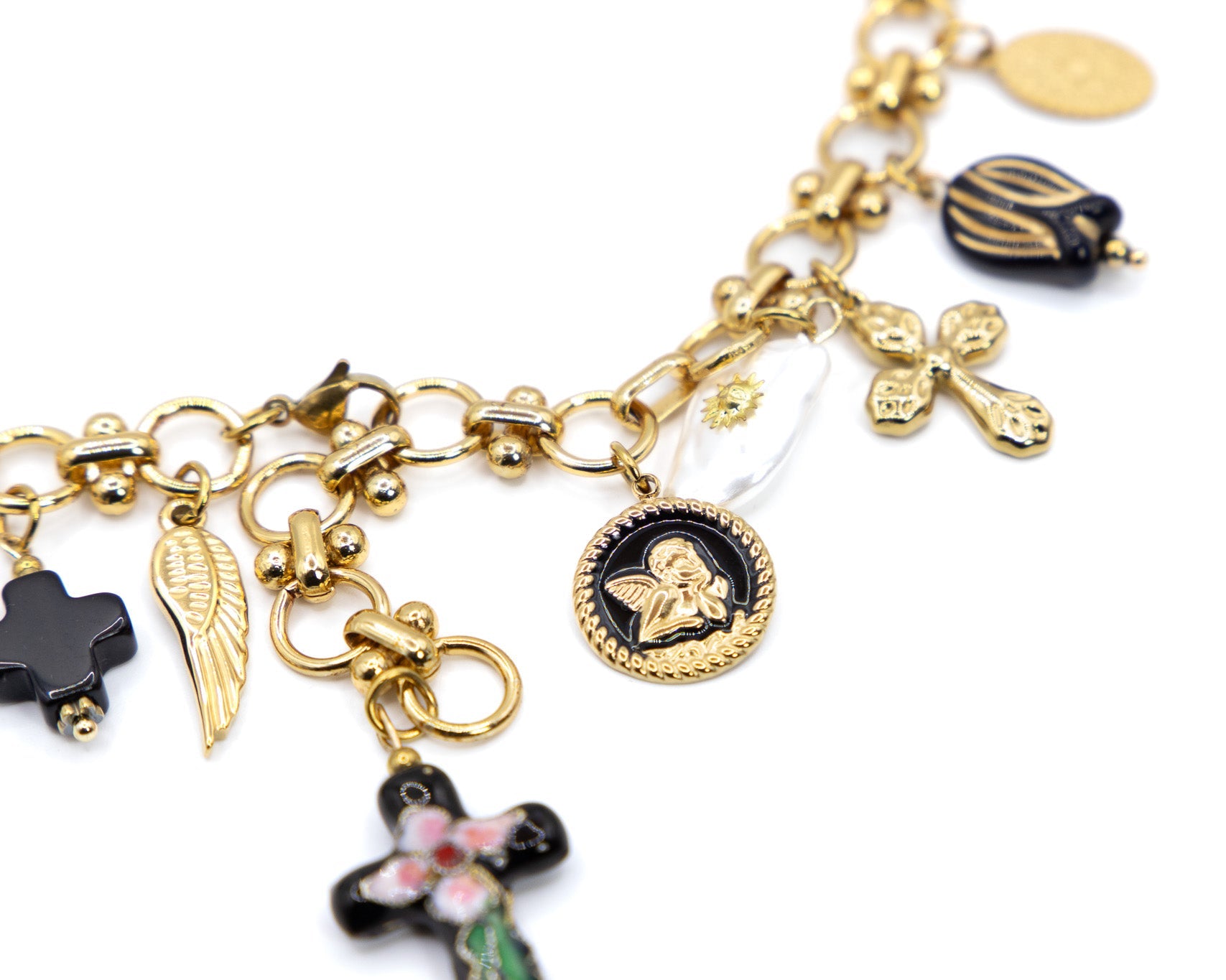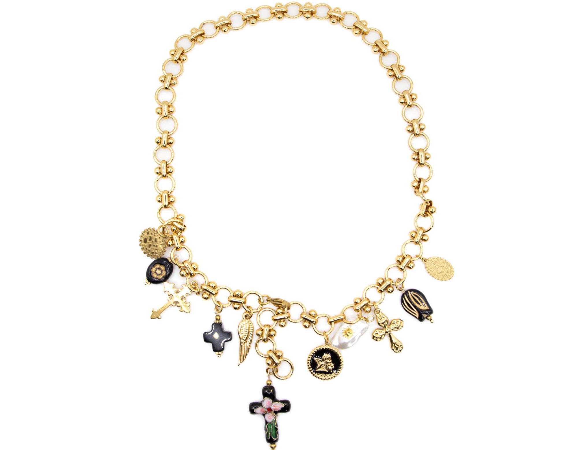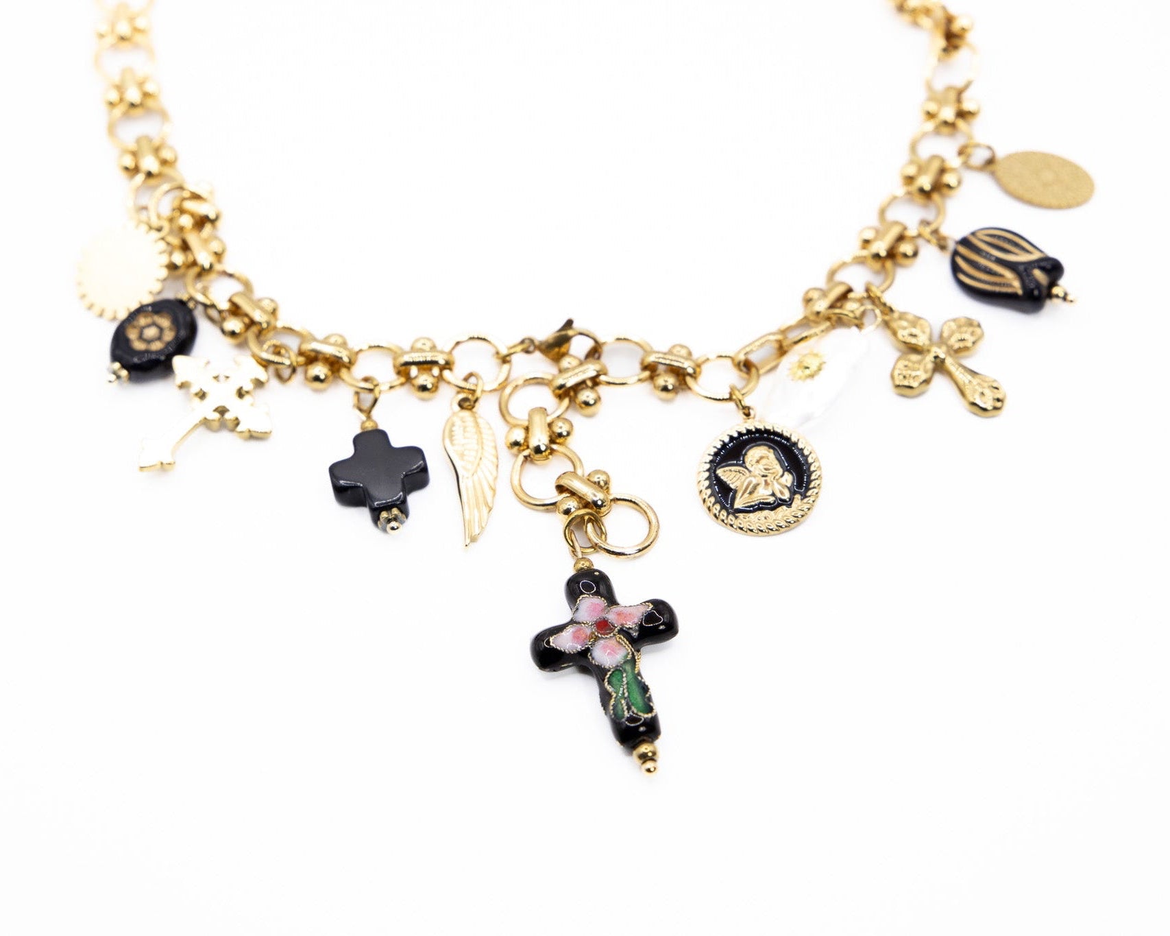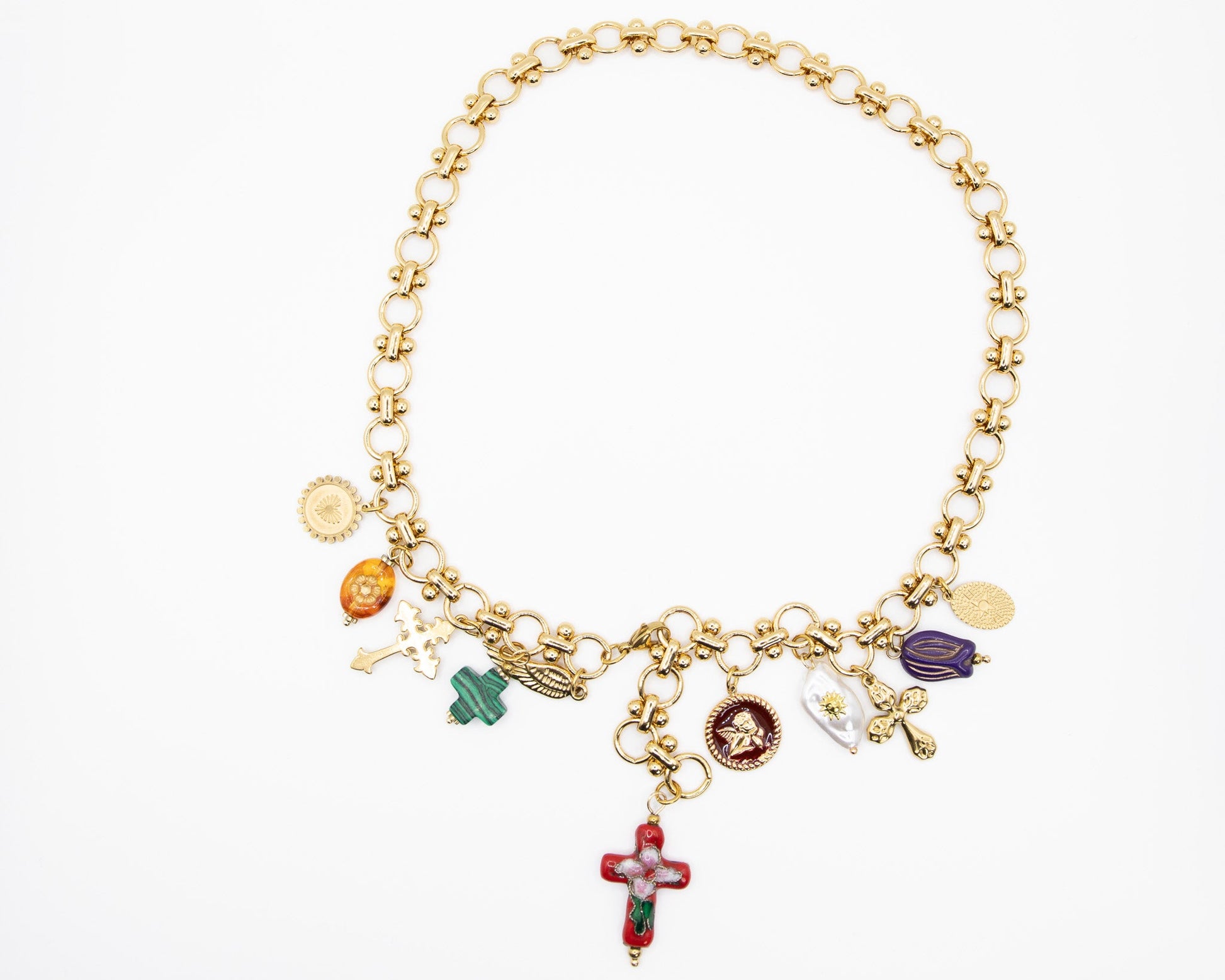 Una cascata di charms smaltati, lucidi e giocosi, che tintinnano a ogni passo: Babbo Natale, alberelli, pacchi regalo e campanelle, tutti appesi a una catena dorata che non ha paura di farsi notare. Un mix tra ironia e incanto. Perché a Natale anche il tuo look merita un brindisi.